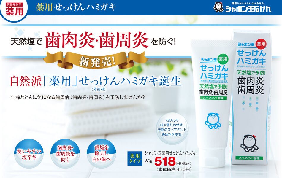 成分 : 重質炭酸Ca[清掃剤]、濃グリセリン[湿潤剤]、塩化Na[有効成分]、キサンタンガム、無水ケイ酸[粘結剤]、石けん用素地、炭酸水素Na[洗浄剤]、香料(ハッカ油、スペアミント油)[香味剤]、クエン酸Na、無水クエン酸[pH調整剤]